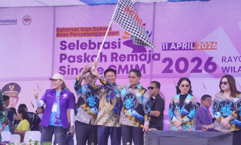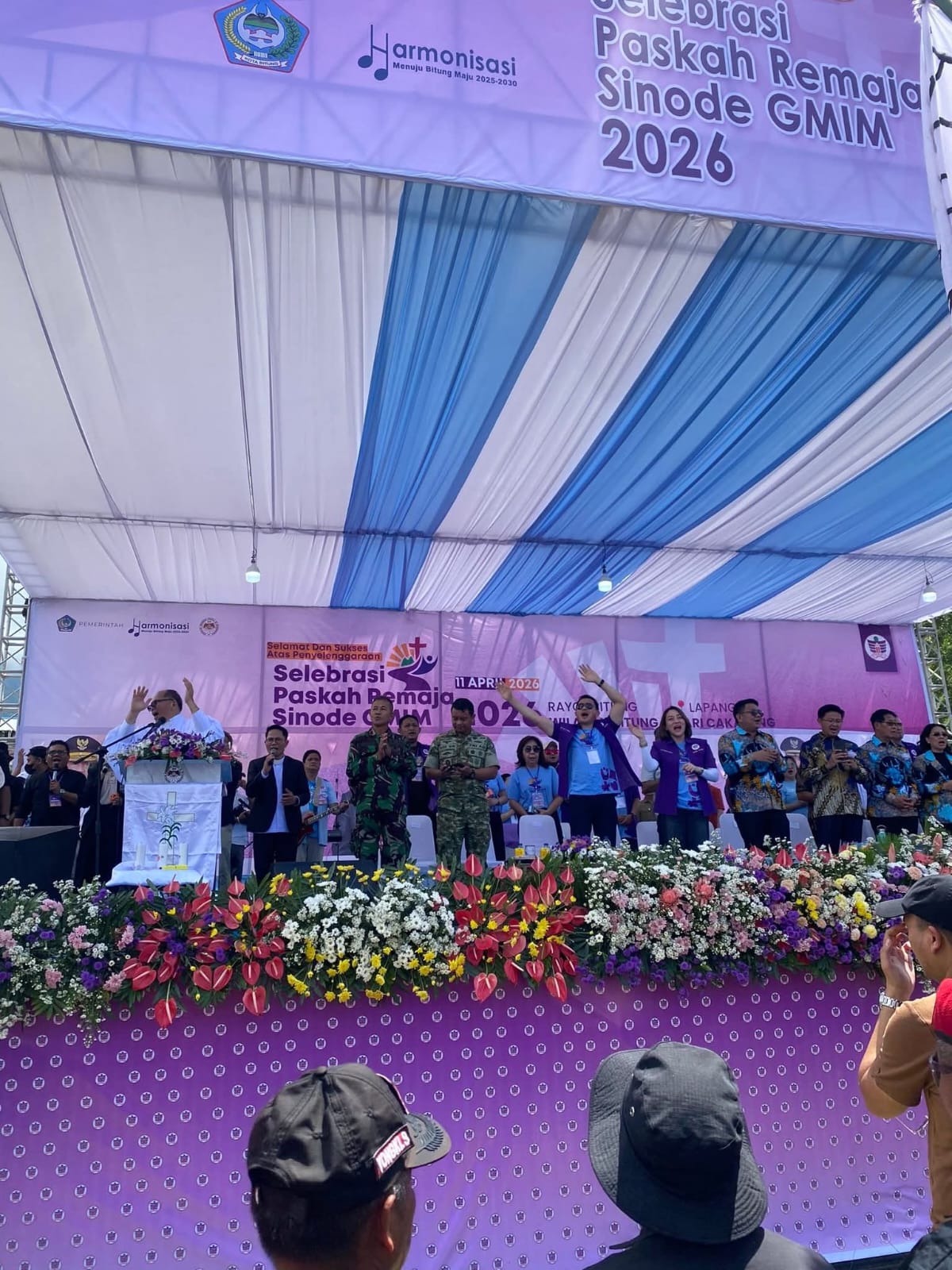 Bitung,KOMENTAR –Wali Kota Bitung, Hengky Honandar, SE didampingi Ketua TP PKK Ellen Honandar Sondakh, SE,menghadiri kegiatan Selebrasi Paskah Remaja Sinode Gereja Masehi Injili di Minahasa Tahun 2026 berlangsung di Lapangan Sari Cakalang, Kecamatan Madidir, Kelurahan Madidir Ure, Sabtu (11/04/2026).